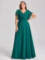 This A-line bridesmaid dress features a flattering V-neckline and delicate short sleeves for graceful coverage. Made from soft chiffon with pleated details, it offers elegant movement and texture. The corset bodice shapes the waist, while the floor-length skirt creates a sophisticated and flattering silhouette-perfect for plus size bridal parties.