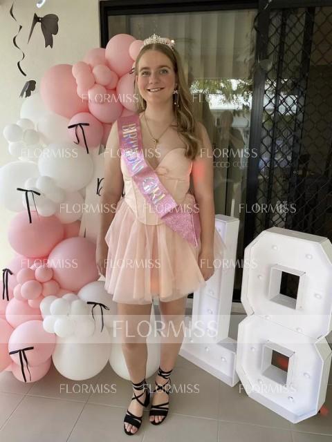 This ball-gown dress features a halter neckline and a sleeveless bodice with a structured corset that defines the waist. The full skirt adds volume and drama while a bow detail provides a playful and feminine touch. Designed in a short or mini length, it is ideal for parties homecoming or special occasions.