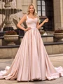 This stunning ball gown wedding dress features elegant straps and a sleeveless design, adorned with intricate beading for a touch of sparkle. The luxurious satin fabric flows into a voluminous skirt, creating a dramatic silhouette, while the cathedral train adds a regal and timeless finish. Perfect for a bride who desires a grand and glamorous look on her special day.