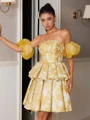 This ball gown features a sleek straight neckline with short sleeves. The corset bodice shapes the waist, creating a flattering silhouette. The short/mini length adds a playful and modern touch