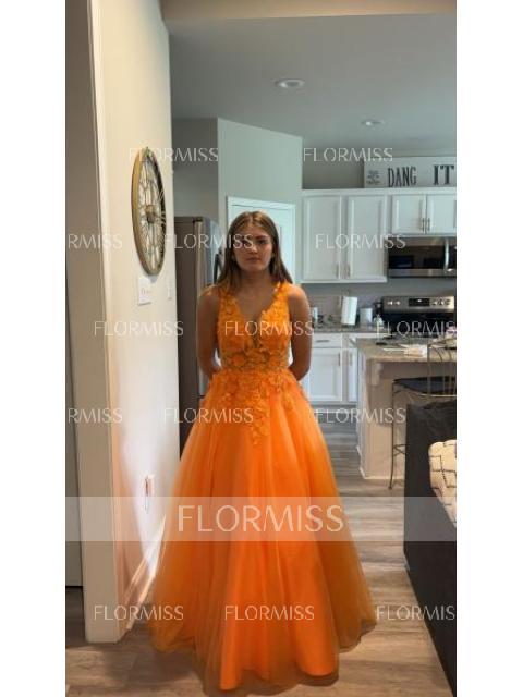 • Ball Gown V-neck Floor-Length Tulle Prom Dresses With Appliques Lace