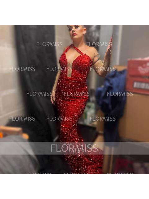 • Mermaid One-Shoulder Court Train Velvet Sequins Dress