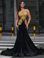 Mermaid One-Shoulder Long Sleeves Appliques Lace Floor-Length Velvet Dress