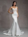 Alluring mermaid wedding dress featuring spaghetti straps, a sleeveless design, and intricate lace appliques. The gown is crafted from luxurious satin and boasts a chapel train, while the corset detail enhances the overall romantic and sophisticated appeal of this stunning bridal ensemble.