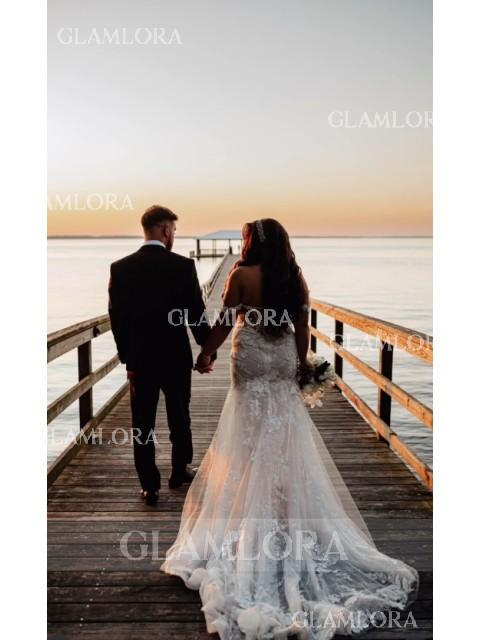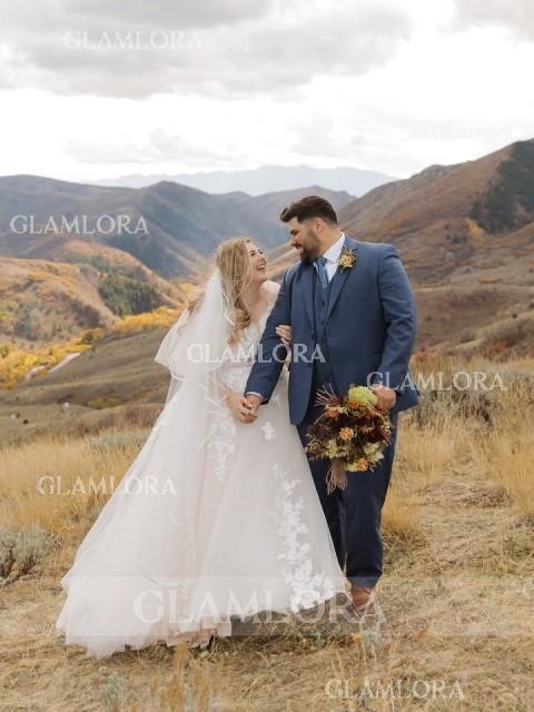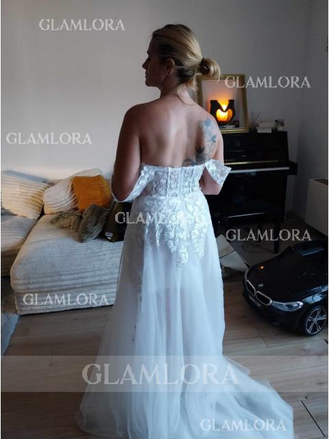 Exquisite A-line Off-the-Shoulder Long Sleeves Appliques Lace Chapel Train Tulle Corset Wedding Dress $335.00 $670.00 (2)