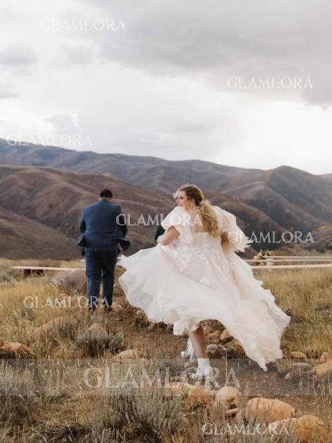 Enchanting A-line V-Neck Long Sleeves Appliques Lace Court Train Tulle Plus Size Wedding Dress $365.00 (3)