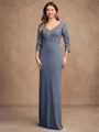 • Sheath/Column Jersey Lace V-neck 3/4 Sleeves Floor-Length Mother of the Bride Dresses