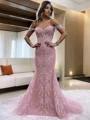 • Sheath/Column Off-the-Shoulder Court Train Lace Prom Dresses With Appliques Lace