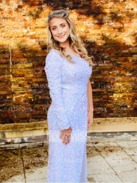 • Sheath/Column One-Shoulder Sweep Train Velvet Sequins Prom Dresses With Leg Slit