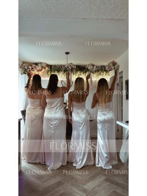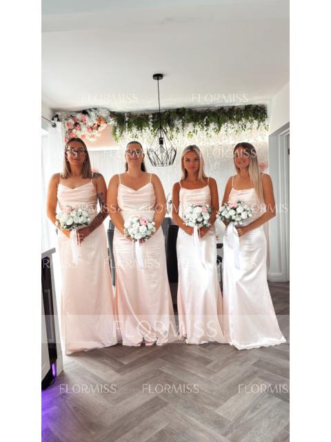 Sheath/Column Spaghetti Straps Floor-Length Silk like Satin Bridesmaid Dresses With Leg Slit