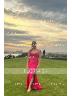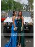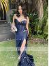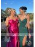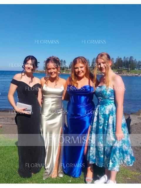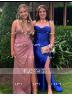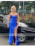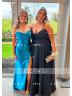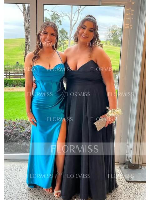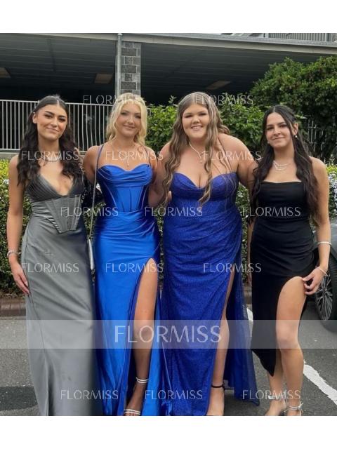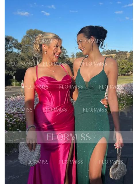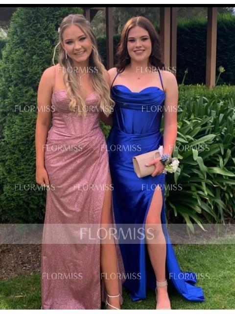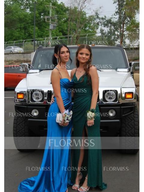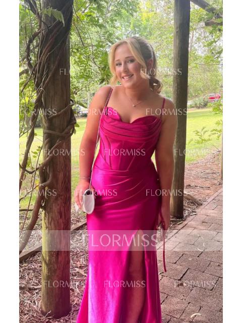 • Sheath/Column Spaghetti Straps Sweep Train Silk Like Satin Prom Dresses With Leg Slit