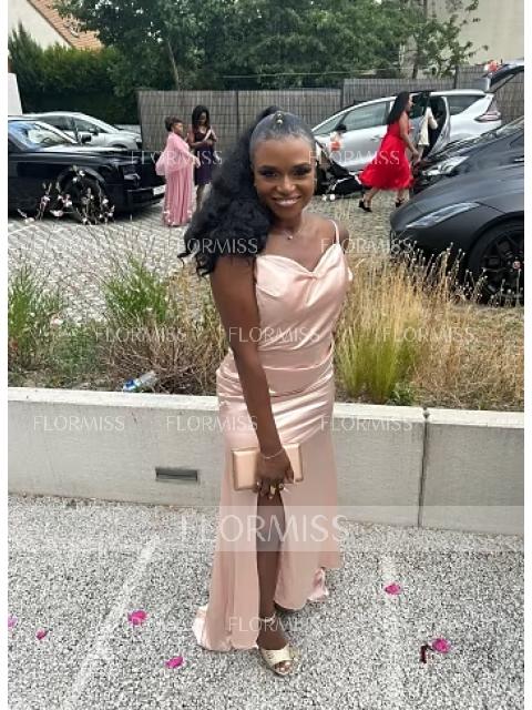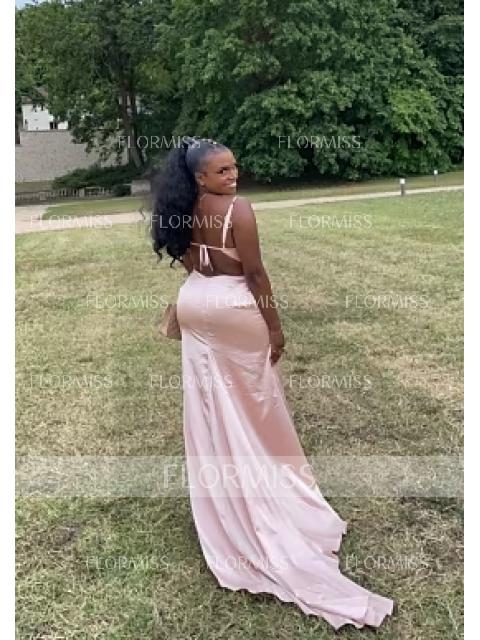 Sheath/Column V-neck Sweep Train Silk Like Satin Prom Dresses