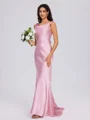 This chic sheath dress features a draped cowl neckline and sleeveless design. Made from silk-like satin, it offers a luxurious feel with a charming bow detail at the waist and a sweeping train for an elegant finish.