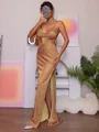 Embrace a chic look in this sheath dress with a halter neckline, sleeveless design, and a sweeping train. The dress exudes elegance, offering a stylish and sophisticated ensemble.