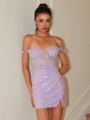 This sheath dress features a graceful off-the-shoulder neckline and sleeveless design. Adorned with delicate lace appliques and shimmering sequins, it combines elegance with sparkle. The corset bodice defines the waist, while the short/mini length creates a sleek, sophisticated silhouette