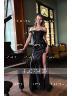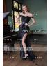 A form-fitting sleeveless sheath dress with an off-the-shoulder neckline, adorned with lace appliques. It includes a sweep train and is made from silk like satin with a corset for a structured fit.