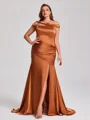 This sheath bridesmaid dress features an elegant off-the-shoulder neckline and sleeveless design. Crafted from smooth silk-like satin with delicate pleats, it offers texture and sophistication. The corset bodice shapes the waist, while the sweep train adds a graceful and flowing silhouette-perfect for plus size bridal parties.