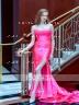 A stunning sheath evening dress featuring an off-the-shoulder, sleeveless design adorned with sparkling rhinestones. Flowing into a graceful sweep train, it offers a glamorous and sophisticated silhouette perfect for formal events and special occasions.