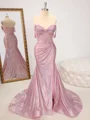 • Sheath Off-the-Shoulder Rhinestone Sweep Train Metallic Satin Corset Dress