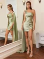 This sheath dress features a one-shoulder neckline and a sleeveless corset bodice that shapes and defines the waist. Made from silk-like satin, the fabric has a smooth and luxurious feel. The pleated design adds texture and elegance to the fitted silhouette. The short or mini length creates a sleek and sophisticated look, perfect for parties, cocktail events, or special occasions.