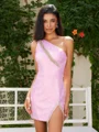 This glamorous sheath dress features a striking one-shoulder neckline and a sleeveless design that elegantly showcases the shoulders. Adorned with sparkling rhinestones, the dress adds a dazzling touch of glamour and sophistication. The corset-style bodice offers a structured, figure-enhancing fit, while the short or mini length creates a chic and modern silhouette. Perfect for evening events, parties, or special occasions where you want to shine.