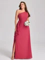 This sheath bridesmaid dress features a stylish one-shoulder neckline and sleeveless design. Crafted from soft chiffon, it is adorned with delicate ruffles adding movement and elegance. The corset bodice shapes the waist, while the floor-length skirt creates a graceful and flattering silhouette-perfect for plus size bridal parties.