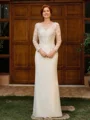 This floor-length chiffon mother of the bride dress features a sleek sheath silhouette, accentuated by a classic scoop neckline and elegant long sleeves. Delicate lace appliques adorn the ensemble, adding a touch of romance and femininity. Perfect for a mother who desires a sophisticated and graceful look for her daughter's wedding.