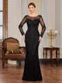 A graceful sheath Mother of the Bride dress featuring a scoop neckline and long sleeves. The dress is beautifully embellished with appliqu