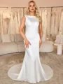 This refined sheath wedding dress features a scoop neckline and sleeveless design, combining simplicity with elegance. The bodice is softly pleated, adding texture and charm, while the satin chiffon fabric offers a lightweight, graceful flow. The silhouette extends into a chapel train, creating a romantic and polished finish. Perfect for modern brides, this dress blends understated beauty with timeless sophistication.