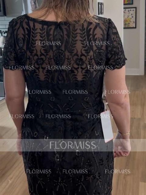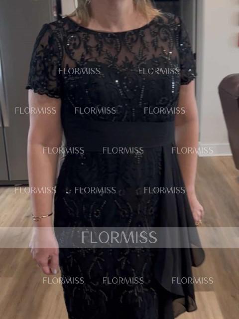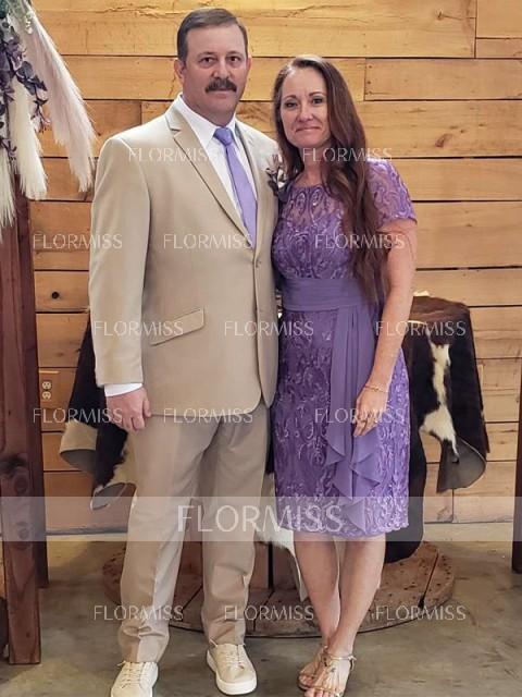Chic and elegant, this knee-length chiffon mother of the bride dress features a sheath silhouette with a classic scoop neckline and short sleeves. Delicate lace appliques adorn the bodice, adding a touch of romance to the design. Perfect for a sophisticated and memorable look on your daughter's special day.