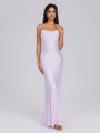A sheath bridesmaid dress with delicate spaghetti straps and a sleeveless design. This ankle-length dress offers a sleek and modern silhouette, perfect for a chic and understated look at any formal event.