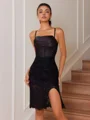 This sheath dress features delicate spaghetti straps and a sleeveless design. Adorned with intricate lace appliques over smooth silk-like satin, it offers a romantic and elegant look. The corset bodice shapes the waist, while the short/mini length creates a chic and flattering silhouette