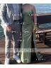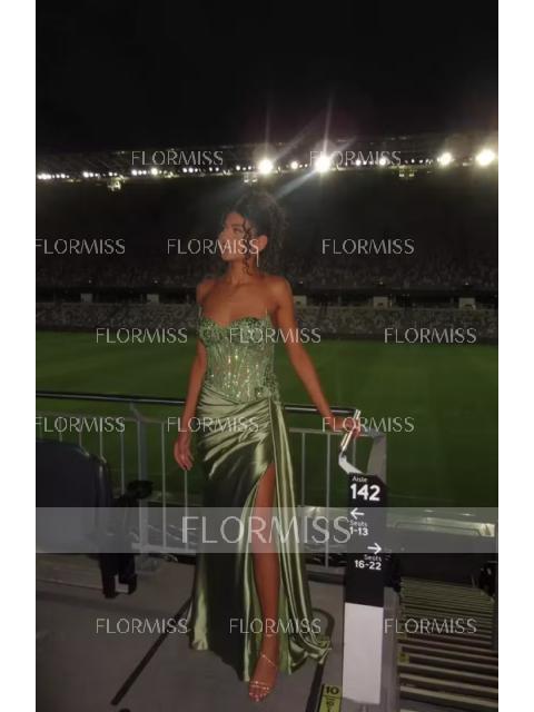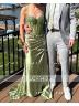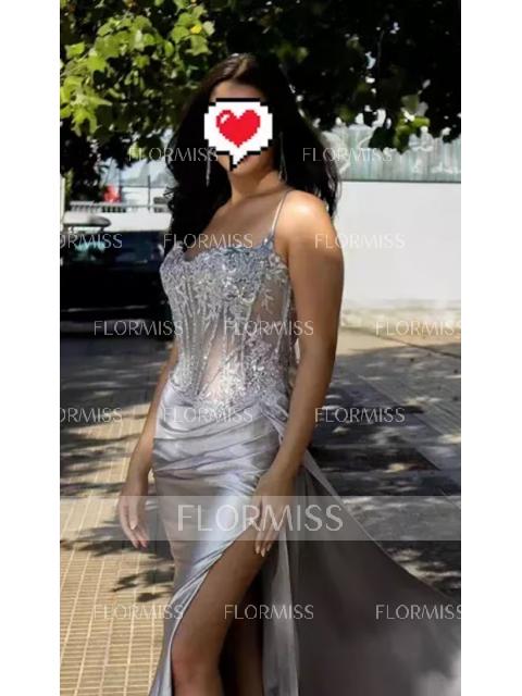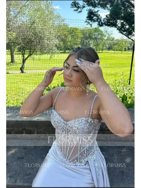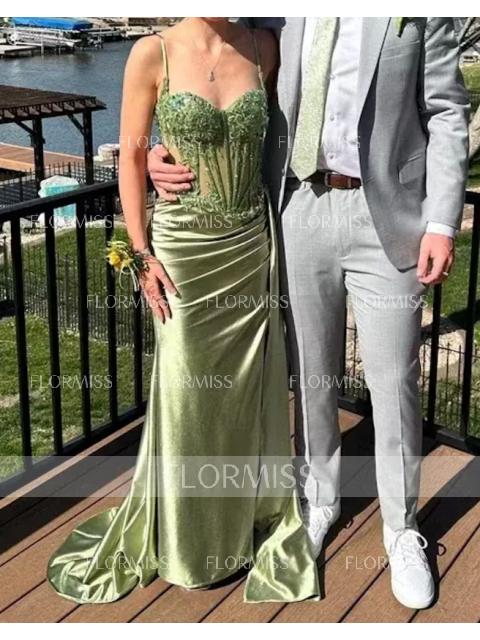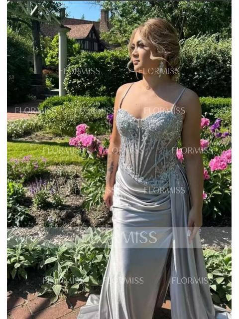A sheath dress with spaghetti straps and sleeveless design, adorned with intricate lace appliques. Made from silk-like satin, it features a corset bodice for a structured fit and a sweep train for added elegance. Perfect for a luxurious and sophisticated look.