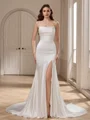 Sleeveless sheath wedding dress with spaghetti straps, pleated details, and a chapel train in silk like satin fabric.