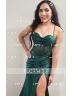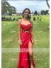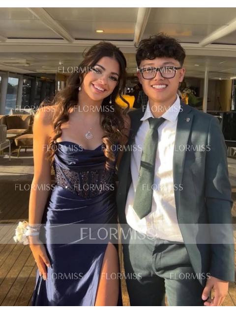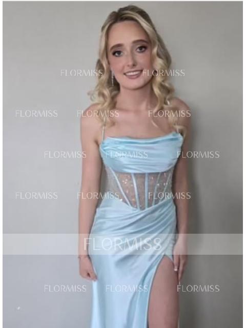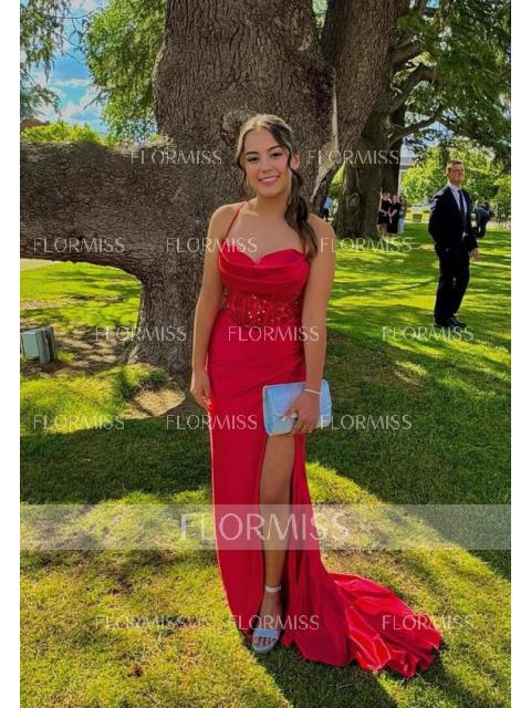 Stunning sleeveless corset dress with sheath silhouette, spaghetti straps, and pleated design. Made from silk like satin, it features a graceful sweep train for added elegance.