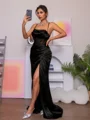 Capture attention in this sheath dress featuring spaghetti straps, a sleeveless design, and chic pleats. The dress is elegantly enhanced with a sweeping train and a silk-like satin corset, creating a sophisticated and alluring ensemble.