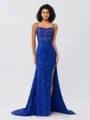 A form-fitting sheath dress featuring delicate spaghetti straps and a sleeveless design, adorned with shimmering sequins. It includes a sweeping train for added elegance.