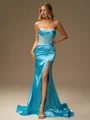 • Sheath Straight Appliques Lace Sweep Train Silk Like Satin Corset Dress