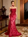 Step into elegance with this sheath prom dress featuring a straight, sleeveless silhouette. Crafted from delicate lace, the floor-length design flows into a graceful sweep train adorned with floral details, creating a romantic and sophisticated look perfect for formal occasions.