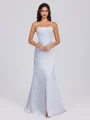 A sheath straight-neck sleeveless bridesmaid dress with pleats and a floor-length satin design, featuring a corset-style bodice. This dress offers a sleek, structured silhouette with a touch of elegance, ideal for a refined and classic bridal party look.