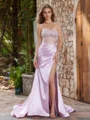 A sleek sheath dress with a straight silhouette, featuring a sleeveless design and a corset bodice for a structured, flattering fit. Rhinestone embellishments add sparkle and glamour, while the sweep train enhances the elegant flow. Crafted from silk-like satin, it