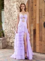 A romantic sheath dress with a sweetheart neckline and sleeveless design, crafted from soft tulle. Cascading ruffles add texture and movement, while the sweep train creates an elegant flow. Perfect for weddings or formal occasions, this dress combines femininity and sophistication.