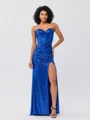 A form-fitting sleeveless sheath dress with a sweetheart neckline, pleated details, and adorned with sequins. It features a sweeping train and includes a corset for a structured fit.