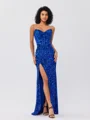 A form-fitting sleeveless sheath dress with a sweetheart neckline, adorned with velvet and sequins. It features a sweeping train and includes a corset for a structured fit.