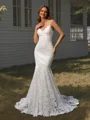 Sleeveless sheath wedding dress with a V-neck, lace appliques, and a court train in lace fabric.