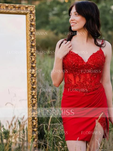 This sheath dress showcases a V-neckline and sleeveless design adorned with delicate lace appliqu