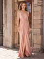 A sleek sheath dress with a V-neckline and sleeveless design, featuring pleated detailing that adds texture and movement. The floor-length hem creates an elegant silhouette, making it perfect for formal events or special occasions.
