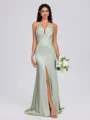 This elegant sheath dress features a V-neckline and sleeveless design, enhanced with pleating for added texture. The floor-length silk-like satin fabric flows gracefully with a sweeping train, creating a sophisticated and polished look.