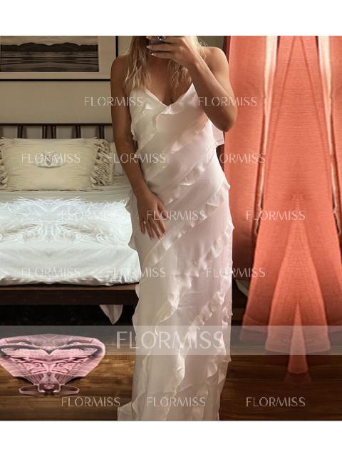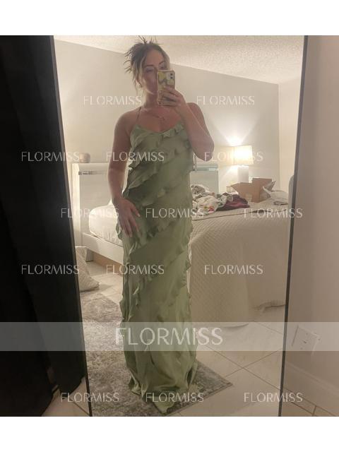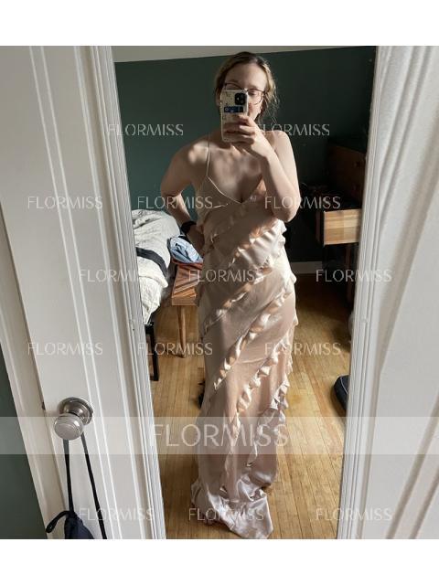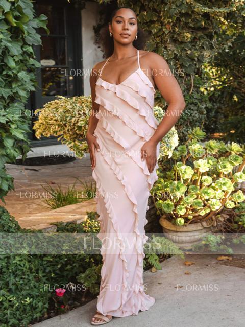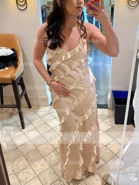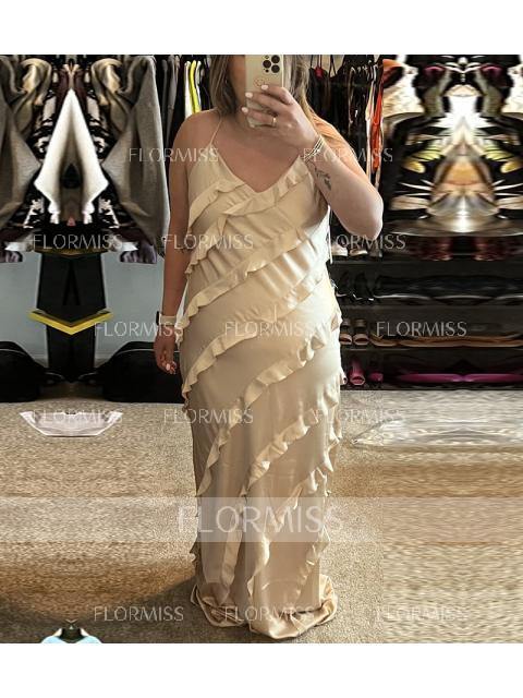This floor-length bridesmaid dress features a sleek sheath silhouette, accentuated by a sophisticated V-neckline and sleeveless design. Ruffles add a touch of elegance and movement, while the silk-like satin fabric offers a luxurious and refined appearance. Perfect for a bridesmaid who desires a chic and graceful look for the wedding.