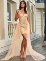 This stunning dress exudes contemporary elegance with its sleek sheath silhouette and sweeping train detail. Designed with a flattering V-neckline that accentuates the neckline and shoulders gracefully, the dress offers a sophisticated and refined look. The sleeveless design enhances its modern appeal, ideal for showcasing a streamlined silhouette. Crafted from high-quality fabric, the dress drapes beautifully and ensures comfort with every step. The sweep train adds a dramatic touch, making it perfect for formal events or special occasions where a statement-making entrance is desired. This dress combines timeless charm with modern sophistication, ensuring a memorable and stylish appearance.